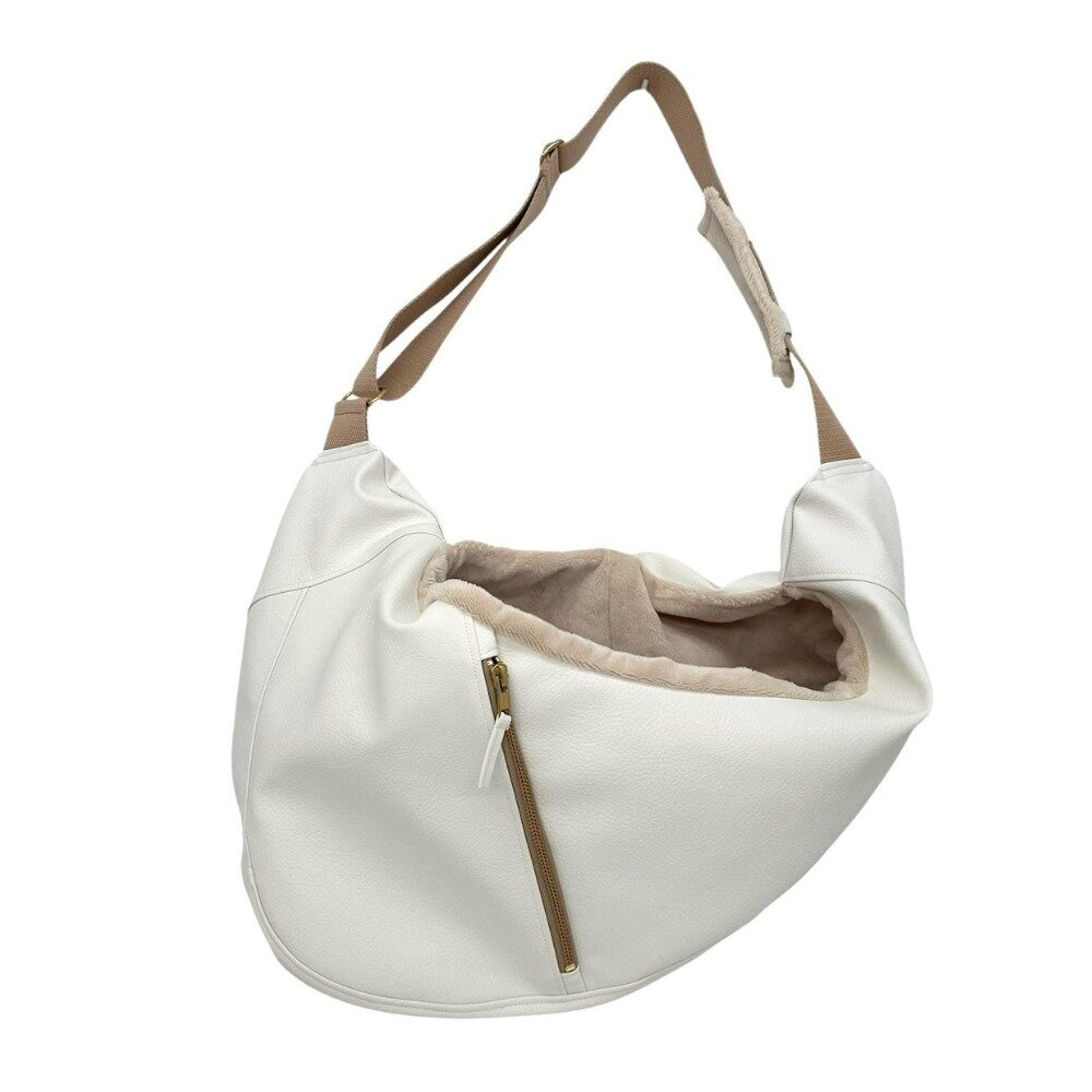 Deze prachtige, handgemaakte hondentas van wit leer is een stevige en comfortabele draagtas. Ideaal voor hondenliefhebbers die graag hun handen vrij hebben tijdens het wandelen.